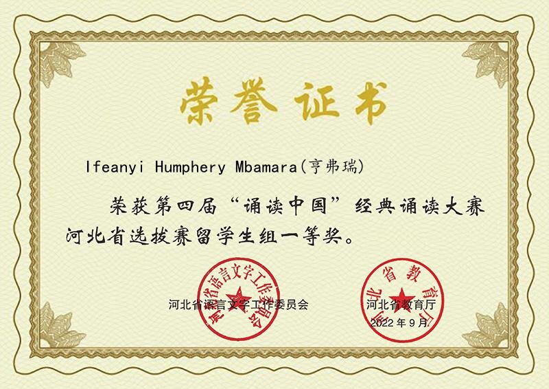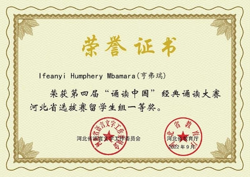 近日,从省里传来好消息,我校三名留学生的诵读作品在第四届“诵读中国”经典诵读大赛河北省选拔赛中取得了优异成绩。2017级留学生Ifeanyi Humphery Mbamara朗诵的《再别康桥》和2016级留学生Asad Hanif朗诵的《致橡树》分别获得留学生组一等奖,2018级留学生Bridget Boateng Senya朗诵的《中国话(节选)》获得留学生组二等奖。国际教育学院教师乔媛媛、郭淳及党委宣传统战部李牧乘老师获得优秀指导教师奖。 (点击每张图片即可查看原图)
