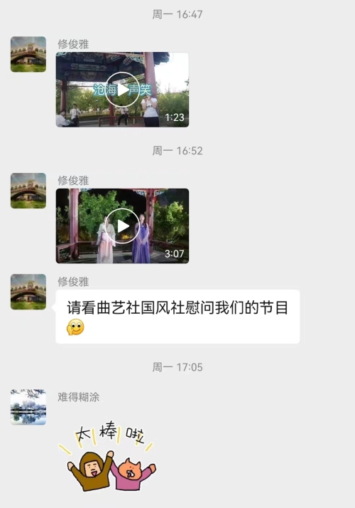 根据疫情防控形势,为避免聚集,联谊会采取线上方式进行。离退休老同志纷纷将精心录制的舞蹈、歌曲、古筝演奏等视频音频和诗歌、书画等作品上传微信群,供同学和老同志欣赏,共祝节日安康。纸艺社、曲艺社、太极协会等七个社团以及中医系2020级中医学2班学生联系班的同学们通过视频为离退休职工表演了瑜伽舞蹈、太极拳、诗歌朗诵、汉服舞蹈等精彩纷呈的节目,并送上节日祝福。 (点击每张图片即可查看原图)