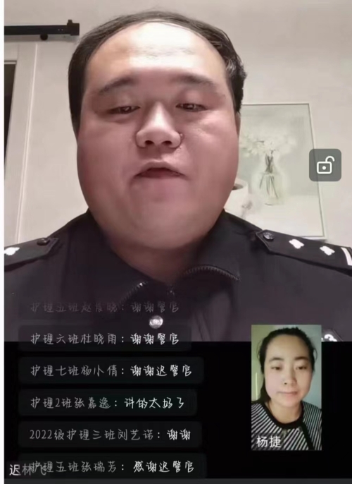 为切实提高在校师生防诈骗意识与能力,预防并减少电信网络诈骗案件的发生,护理系2022级学生工作办公室邀请承德市高新区公安局反诈中心迟林飞警官以线上的方式进行防诈骗安全教育宣讲,护理系辅导员杨捷及2022级护理系全体同学参加此次宣讲。 (点击每张图片即可查看原图)