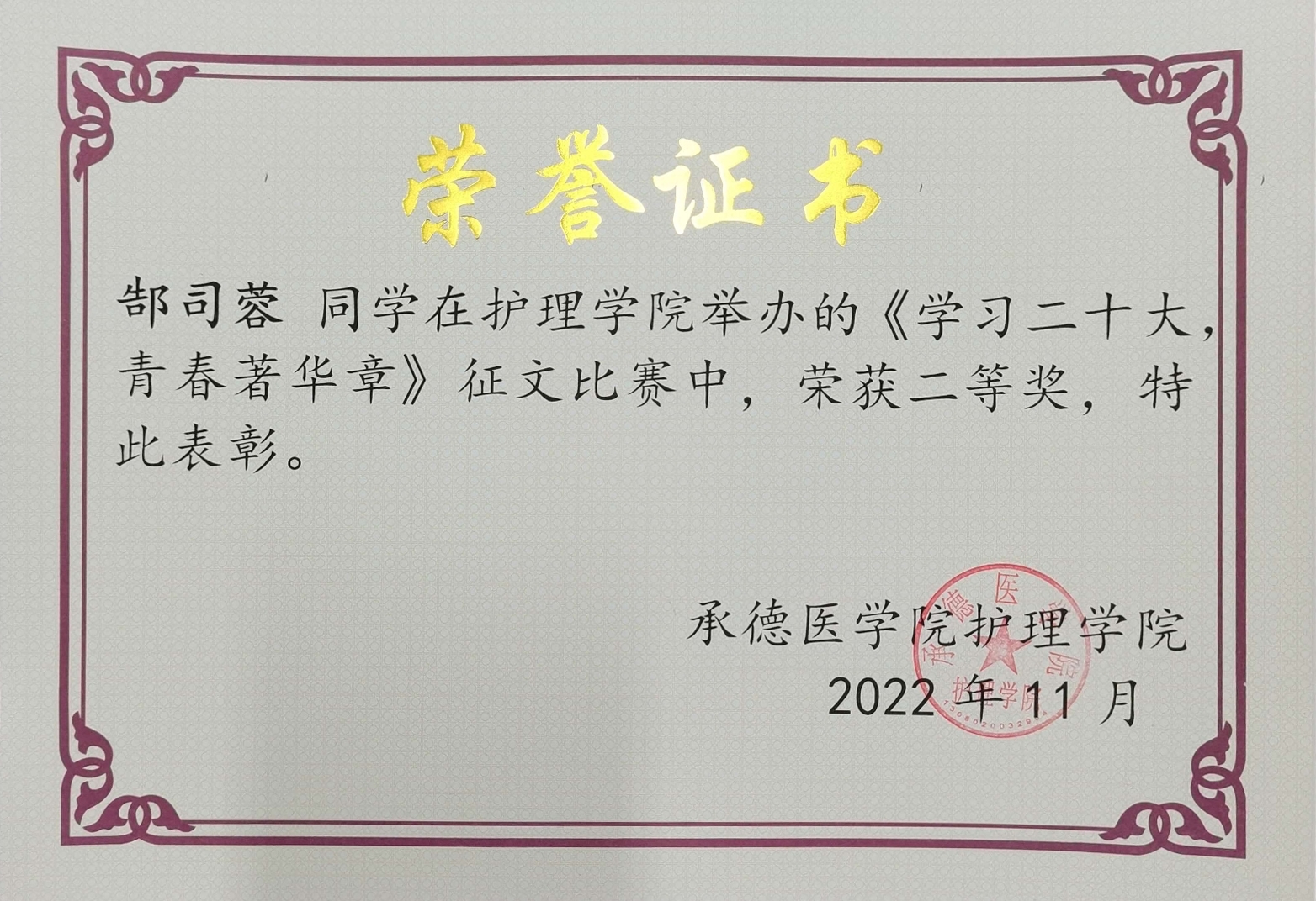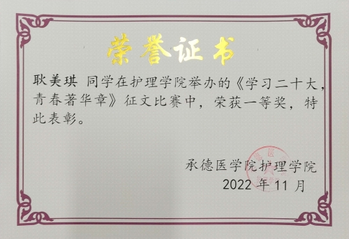 为深入学习和贯彻习近平总书记系列重要讲话精神,宣传学习党的二十大精神,在新时代大学生中厚植爱党、爱国、爱社会主义的情怀,激励广大青年肩负历史使命,坚定前进信心,护理系2020级开展了“学习党的二十大,青春著华章”主题征文活动。 本次活动采用线上参与的形式。活动自启动以来,同学们纷纷踊跃投稿,积极参与,并紧扣当前中国青年责任热点,结合个人成长与学习经历,围绕身边的故事和人、家乡及学校的变化,用有情感、有温度、有力量的作品,书写青年学习、成长、奋斗、奉献的青春故事,歌颂重大革命历史事件中涌现的青年人物及其光辉事迹,记录党领导人民进行革命、建设、改革百年历程中的重大事件和涌现出的先进青年代表。作品以小见大、以点带面,在讲好党史故事、畅谈体会感悟的同时也抒发了爱党爱国情怀,表达了同学们对美好生活和新时代的热爱。经过层层筛选以及评委老师对投稿作品评分,最终评定出一等奖3名,二等奖5名,三等奖7名,优秀奖10名。 (点击每张图片即可查看原图)