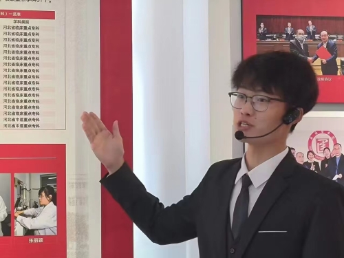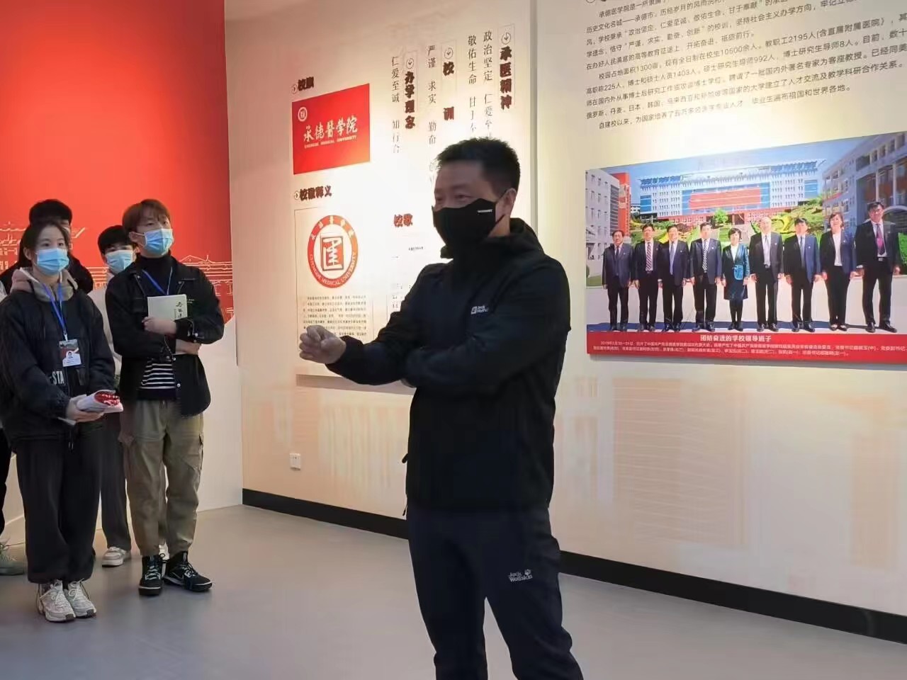 我校学生网络文明志愿者参观校史馆 在指导教师李小彬的引领下,同学们有序进入校史馆参观,校史讲解员李洋、霍玲彤、林文豪进行本次校史讲解。校史馆展厅主要分为四个部分,第一部分主题为“医脉相承传赤心”,是“政治坚定、仁爱至诚、敬佑生命、甘于奉献”承医精神与学校发展史的生动再现。第二部分主题为“精医善教育桃李”,展示的是学校组织建设、红色队伍培育、打造红医品牌和党风建设方面开展的工作以及取得的突出成果。第三部分主题为“德满杏林竞生辉”,展现了我校雄厚的师资力量,介绍了众多优秀校友。第四部分主题是“医道逐梦谱华章”,展示了学校改革发展的巨大成就外,也有对学校未来发展的殷切展望与细致谋划。