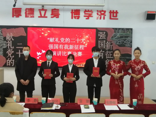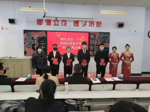 演讲比赛现场 选手演讲结束,王海民进行了比赛总结。他强调,要认真学习贯彻党的二十大精神,牢记党的嘱托,做有理想、敢担当、能吃苦、肯奋斗的新时代好青年。提出广大青年生活在一个良好的社会制度下,生活在一个和平的国家里是非常幸运的,号召大家要树立正确的思想信仰,提高政治敏感性、政治鉴别力,远离邪教,增强忧患意识,斗争精神,防范化解意识形态、网络安全领域各类隐患风险。当今盛世来之不易,青年是引领时代的后备军,也将是主力军,强国有青年,便有新征程。同学们要坚定坚持马克思主义思想指引,始终坚守红色信仰、保持初心,坚定不移跟党走。 颁奖仪式由王海民、李小彬、袁婧分别为一等奖、二等奖、三等奖获奖人员颁奖,并合影留念。至此,“献礼党的二十大,强国有我新征程”主题演讲比赛圆满结束!