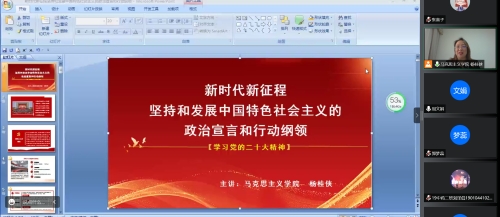 为引导广大党员干部群众更好地学习宣传贯彻党的二十大精神,2022年11月29日下午,中药学系党总支特邀我校马克思主义学院杨桂侠教授为全系师生线上宣讲党的二十大精神。杨桂侠教授以《新时代新征程,坚持和发展中国特色社会主义的政治宣言和行动纲领》为题,围绕“大会主题-党和国家事业发展的总纲”“实践基础-牢牢把握过去五年工作和新时代十年伟大变革的重大意义”“理论指导-牢牢把握习近平新时代中国特色社会主义思想的世界观和方法论”“基本路径-牢牢把握以中国式现代化推进中华民族伟大复兴的使命任务”等七个方面对党的二十大报告进行了全面、深入、系统的解读。 (点击每张图片即可查看原图)
