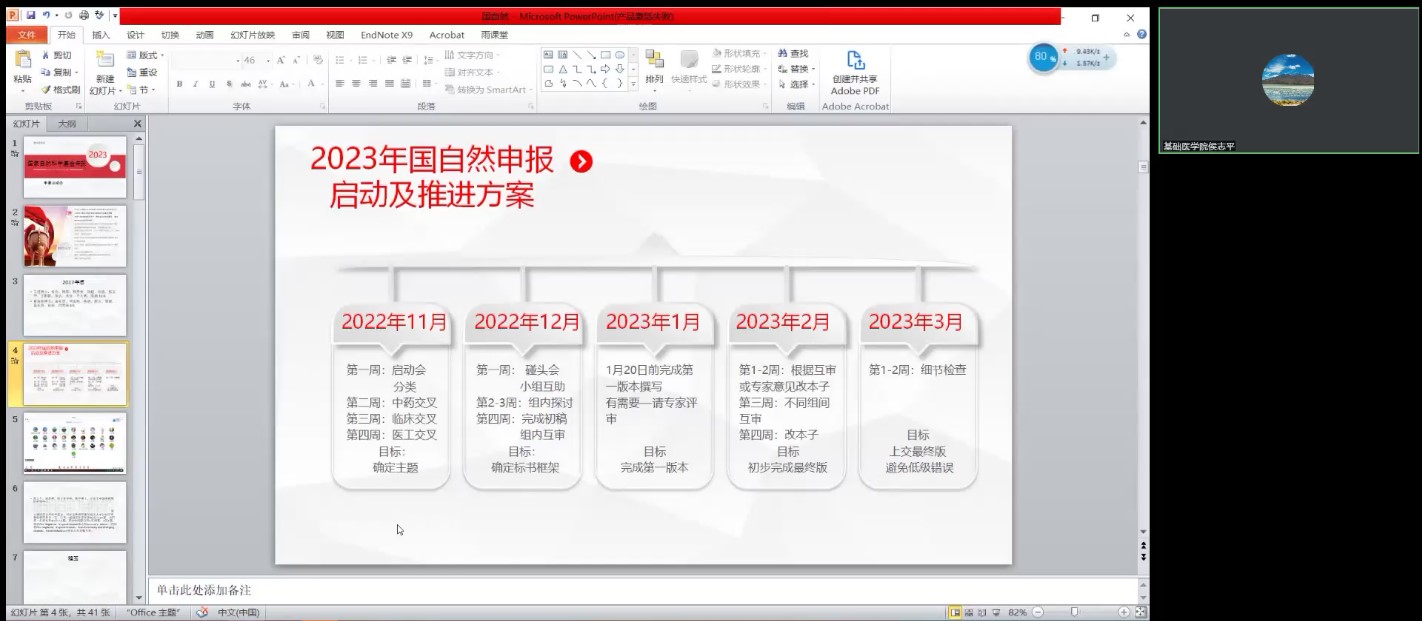 为提前做好基础医学院2023年国家自然科学基金申报工作,2022年11月4日上午,基础医学院组织开展2023年国家自然科学基金申报动员工作会,会议采取线上的方式进行。基础医学院院长毛淑芳、副院长侯志平、各教研室主任、博士以及科研人员参加本次会议。会议由副院长侯志平主持。 (点击每张图片即可查看原图)