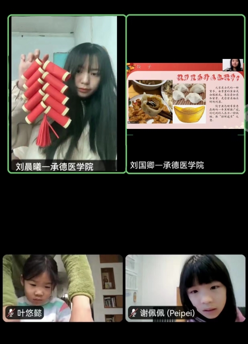 为学习贯彻党的二十大精神,帮助广大海外华裔青少年了解、挖掘和传播中华优秀传统文化,激发其对中国传统医药文化的兴趣,2022年12月12日—23日,由中国侨联主办,河北省侨联、承德市侨联承办,承德医学院协办的2022“亲情中华·为你讲故事”网上冬令营承德中医药文化特色营成功举办。此次冬令营活动共有64名来自英国的海外华裔青少年参加,我校8名教师及7名大学生志愿者参与授课。