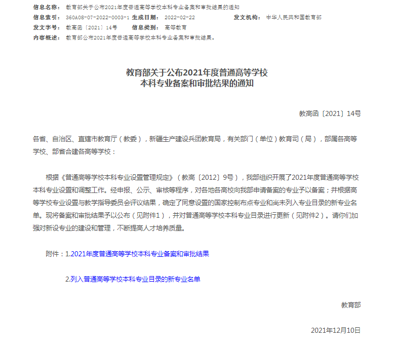 教育部文件 2021年新增本科专业 专业名称 | 专业代码 | 专业门类 | 学位授予门类 | 修业年限 | 儿科学 | 100207TK | 医学 | 医学 | 五年 | 预防医学 | 100401K | 医学 | 医学 | 五年 | 中医康复学 | 100510TK | 医学 | 医学 | 五年 |
