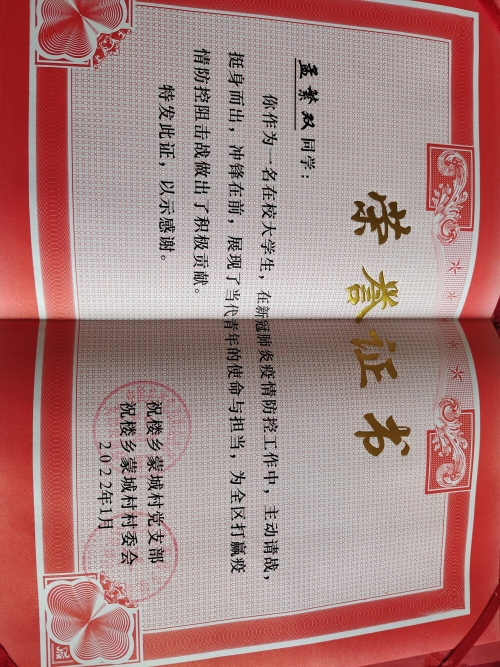 志愿服务我先行,青年学子践初心。进入寒假以来,我校护理系2020级多名学生积极参与家乡社区志愿服务活动,他们牢记总书记的指示,立足新时代,展现新作为,弘扬奉献、友爱、互助、进步的志愿精神,响应国家、学校的号召,以实际行动书写新的雷锋精神,为身边同学做榜样。 疫情防控 志愿有我 护理系2020级2班孟繁双同学在返乡后积极响应社区号召,严格遵守家乡防疫规定。在了解到社区防疫需求后,他主动参加自己所在的河南省新乡市平原新区的疫情防控工作,配合医务人员给返乡人员做核酸、协助居委会进行疫情值班卡点值班以及隔离人员日常生活管理。同时他还灵活运用所学知识向村民们普及防疫知识,守护家乡疫情安全。孟繁双同学不惧严寒坚守在疫情防控的第一线,尽职尽责、不辞辛苦,踊跃参与到疫情防控工作中来,为打赢疫情防控歼灭战奉献爱心和力量,赢得社区居委会的高度赞扬,彰显了当代大学生的青春风采。