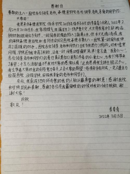 火灾无情人有情,为了帮助这个性格沉稳、学习努力、与人为善的同学,3月10日下午4点,临床学院2018级临床医学5班全体同学在班长的带领下,于见习医院解放军联勤保障部队第九八一医院多媒体教室举办捐款活动,同学纷纷献出了自己的一份爱心。 解放军联勤保障部队第九八一医院作为我校的临床教学基地,一直有着团结务实、厚德怀仁的优良传统。面对火灾给李青青同学带来的无情灾难,3月10日,全院发起了“爱心募捐”的倡议,在院长文学、副院长张志强的带领下,医院领导及员工纷纷伸出援助之手。我校临床学院领导了解情况后,与九八一医院教学培训办电话沟通,表示了衷心感谢,并且向李青青同学提供了临时困难补助。 善款有价,爱心无价,本次捐款活动,彰显了班级同学和医院同心同德、大爱无疆的精神。在李青青面临困境之时,班级同学团结一心,慷慨解囊,这对于受助人而言具有莫大的鼓舞力量。李青青同学的遭遇是不幸的,突如其来的打击让家里所有人身心俱疲。然而她也是幸运的,因为她幸运地生活在解放军联勤保障部队第九八一医院这个大家庭中,因为有班级同学最真挚的爱在伴她同行!