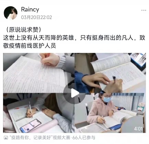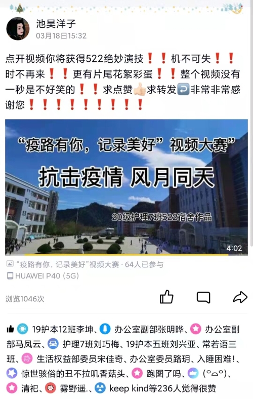 为丰富校园文化生活,展现当代大学生的原创力、洞察力和创新力,营造良好的校园文化氛围,护理系学生会结合目前疫情防控要求于2022年3月16日至27日开展“疫路有你,记录美好”视频大赛活动。 此次活动共有281名同学参加,成功发布视频作品54个。同学们用视频展示出他们的个人风采,记录了上网课、跑早操的日常生活,既倡导了文明健康的生活方式,又表达了同学们战胜疫情的决心与信心,传递着护理系学子积极乐观的精神面貌。此次活动最终评选出一等奖1名、二等奖2名、三等奖3名。其中,一等奖作品《抗击疫情风月同天》浏览量达1046次,获赞236次。 此次活动缓解了同学们线上学习的压力,丰富了课余生活,为同学们提供了一个展示自我和相互交流的平台,展现出护理系学子积极向上、青春洋溢的大学生风采。疫情之下,仍有花开。让我们携起手来,用积极的心态去应对疫情,树立起战胜疫情的必胜信心! (点击每张图片即可查看原图)