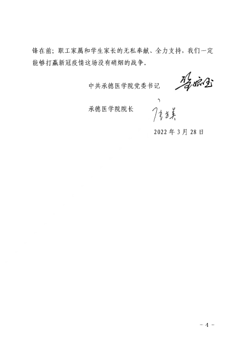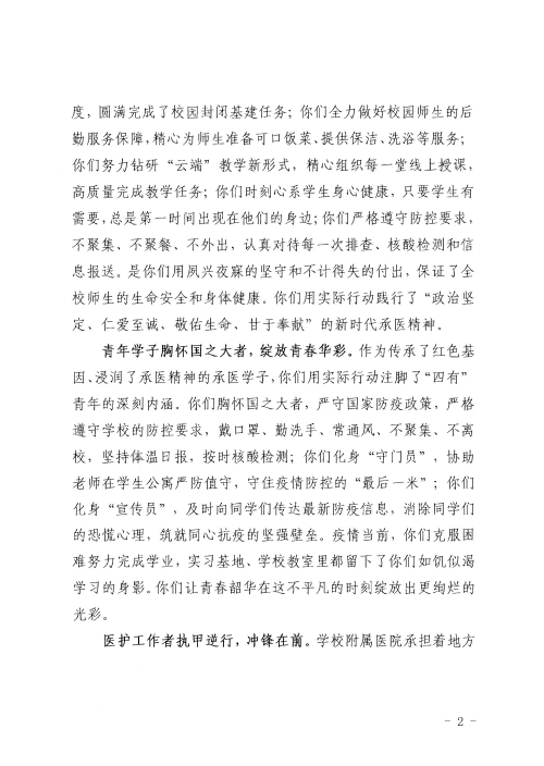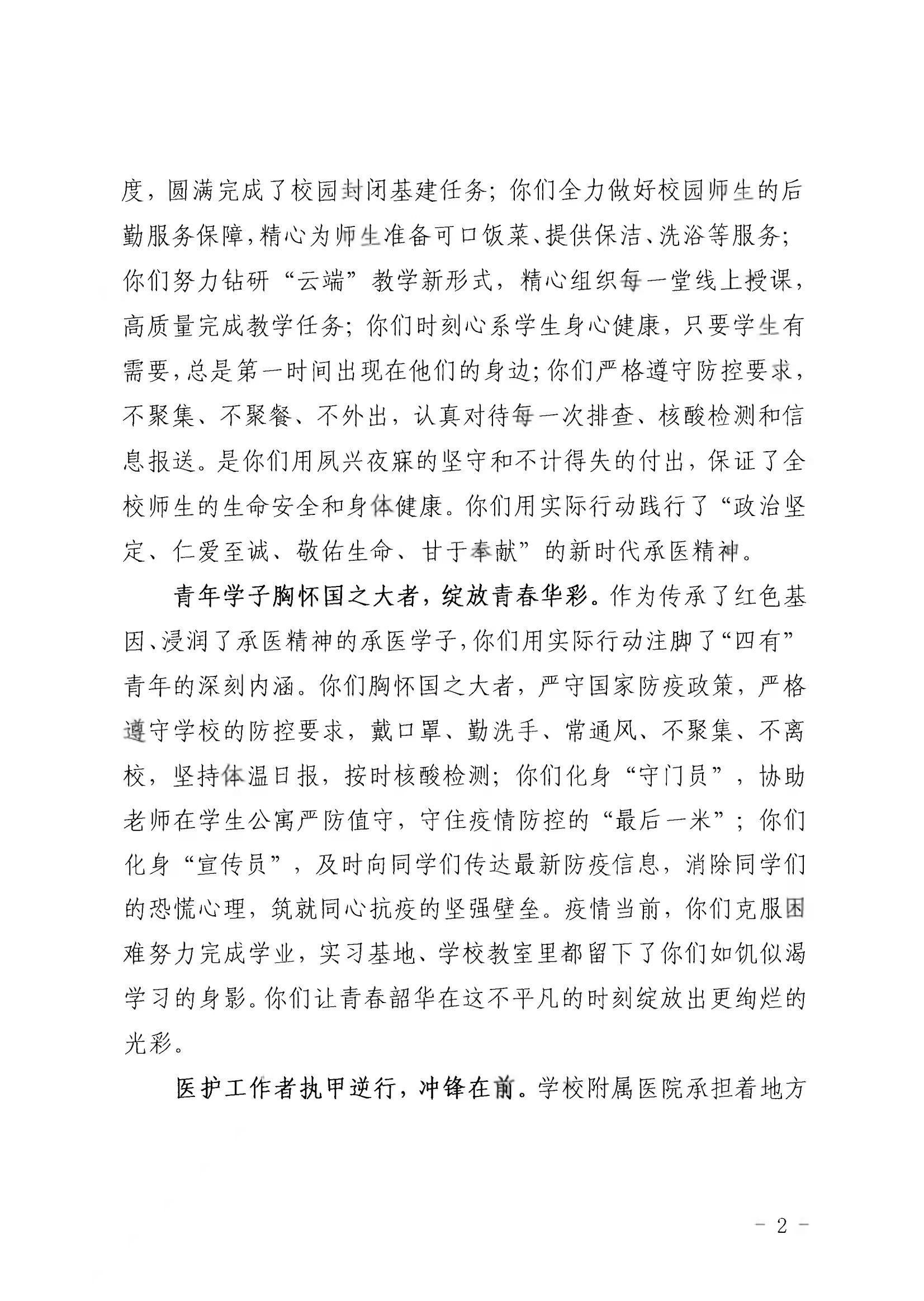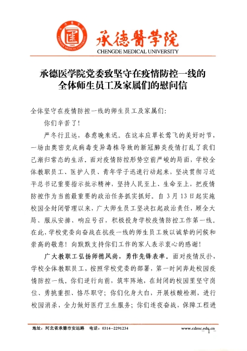 承德医学院党委致坚守在疫情防控一线的全体师生员工及家属们的慰问信
