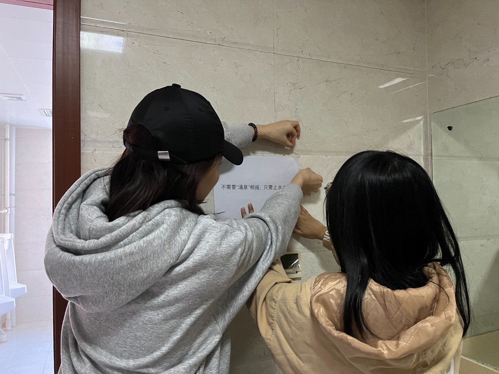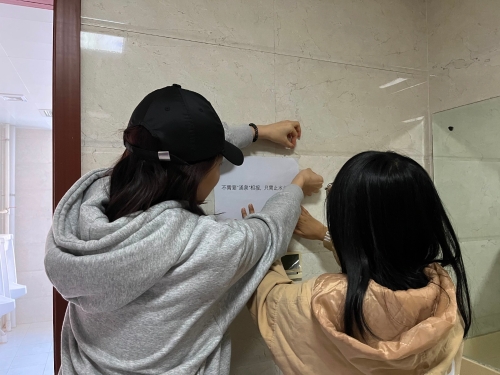 志愿者正在张贴节水宣传标语