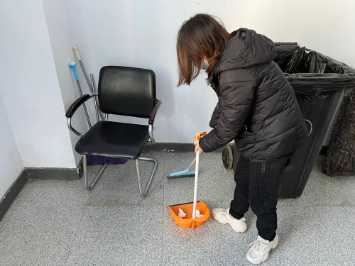 志愿者正在打扫楼道
