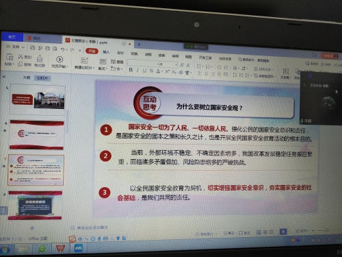 国家安全牢记不忘,居安思危警钟长鸣。为深入贯彻落实总体国家安全观,提高防范和抵御安全风险能力,切实增强师生国家安全意识,营造维护国家安全的浓厚法治氛围,基础医学院2021级第一团总支于2022年4月12日在学校教学楼402教室开展“树牢总体国家安全观,做国家安全践行者”主题线上宣讲会,参加本次会议的有我校思政课教师李静、基础医学院辅导员罗宇老师。 李静老师向各班级班干部作出2022年国家安全教育日的教育指导,李静老师指出今年的国家安全教育日主题为“树牢总体国家安全观,感悟新时代国家安全成就,为迎接党的二十大胜利召开营造良好氛围”并要求学生们坚持以习近平新时代中国特色社会主义思想为指导,深入学习贯彻习近平法治思想,全面贯彻落实党的十九大和十九届历次全会精神,深刻领悟“两个确立”的决定性意义,增强“四个意识”、坚定“四个自信”、做到“两个维护”,坚持总体国家安全观,提高学生防范和应对风险的意识和能力。李静老师就国家安全内容以及大学生如何践行国家安全进行宣讲;罗宇老师就目前学校疫情防控,要求学生们提升践行国家安全意识,要求班干部同学们做好宣讲和督促,疫情防控期间严格遵守学校相关规章制度,增强自身责任意识,以实际行动践行国家安全观。基础医学院2021级第一团总支同时积极在线上组织全体学生开展宪法和国家安全法、反分裂国家法、生物安全法、网络安全法等法律法规的学习。 (点击每张图片即可查看原图)