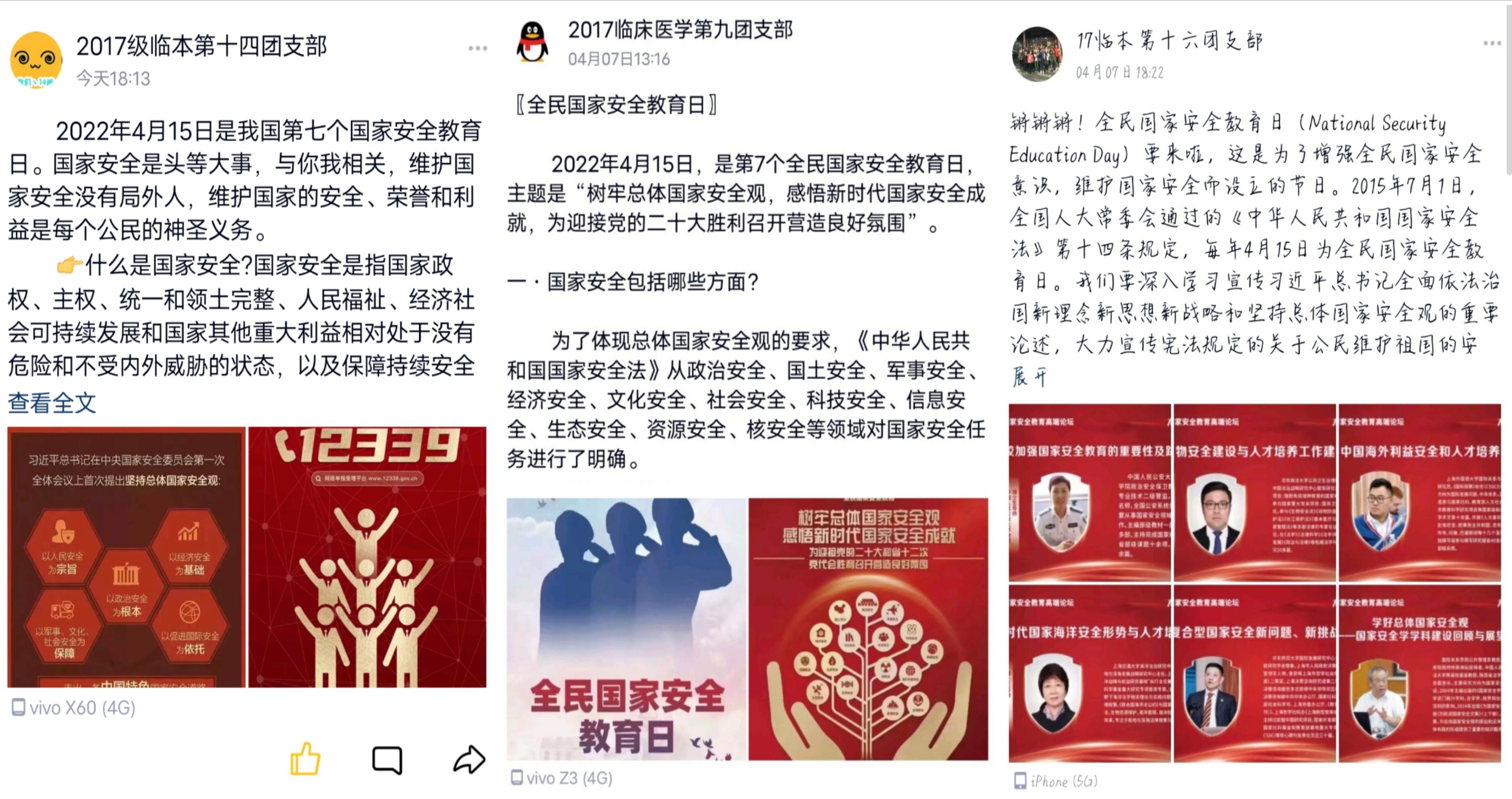 备豫不虞,为国常道。为进一步推动国家安全宣传教育工作深入开展,提高团员青年维护国家安全的意识,增强防范和抵御危害国家安全行为的观念,临床学院2017级团总支于2022年4月7日-13日开展以“增强国家安全意识,共同维护国家安全”为主题的安全教育活动。 首先,分支部开展“国家安全教育日”主题探讨,引导团员们充分认识坚持总体国家安全观、维护国家安全的丰富内涵和重大意义,感悟新时代维护国家安全成就。随后,利用官方QQ进行为期一周的宣传活动,重点宣传宪法规定的关于公民维护国家安全、荣誉和利益的基本义务等,进一步增强团员青年的国家安全意识,强化对国家安全重大意义的认识,营造国家安全宣传教育浓厚氛围。 (点击每张图片即可查看原图)