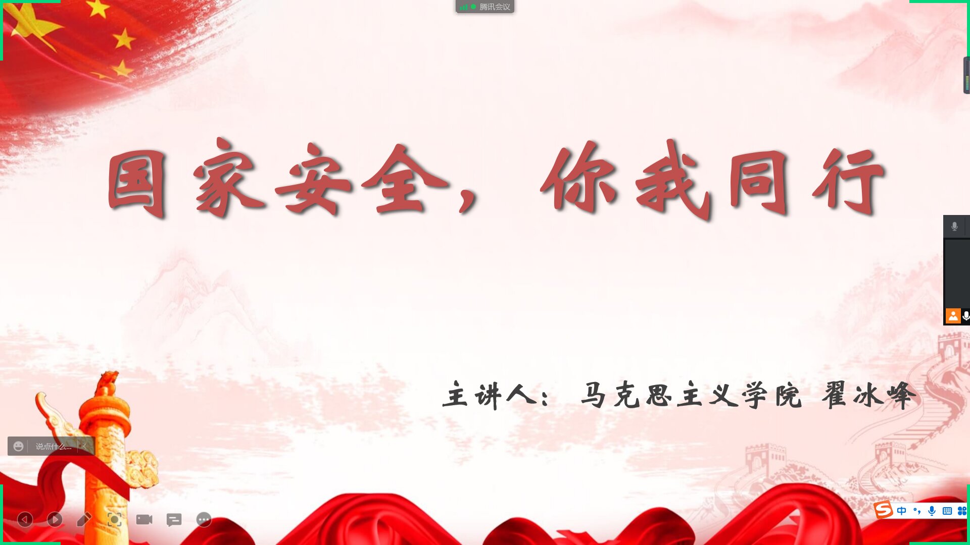 2022年4月15日是第7个全民国家安全教育日。为加强国家安全教育,引导学生牢固树立国家安全意识,基础医学院2021级第二学生工作办公室以第7个全民国家安全教育日为契机,举办“国家安全,你我同行”主题的国家安全宣传教育活动。马克思主义学院思政课教师翟冰峰、相关辅导员参加活动。 4月10日,翟冰峰为全体学生干部做关于“国家安全,你我同行”的线上宣传讲座,从国家安全的概念、当代国家安全内容和作为当代大学生如何维护国家安全三个方面向同学们普及国家安全知识,以身边现实案例为切入口,引导同学们如何用自身行动维护国家安全,提高同学们维护国家安全的意识。