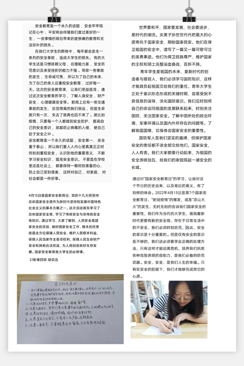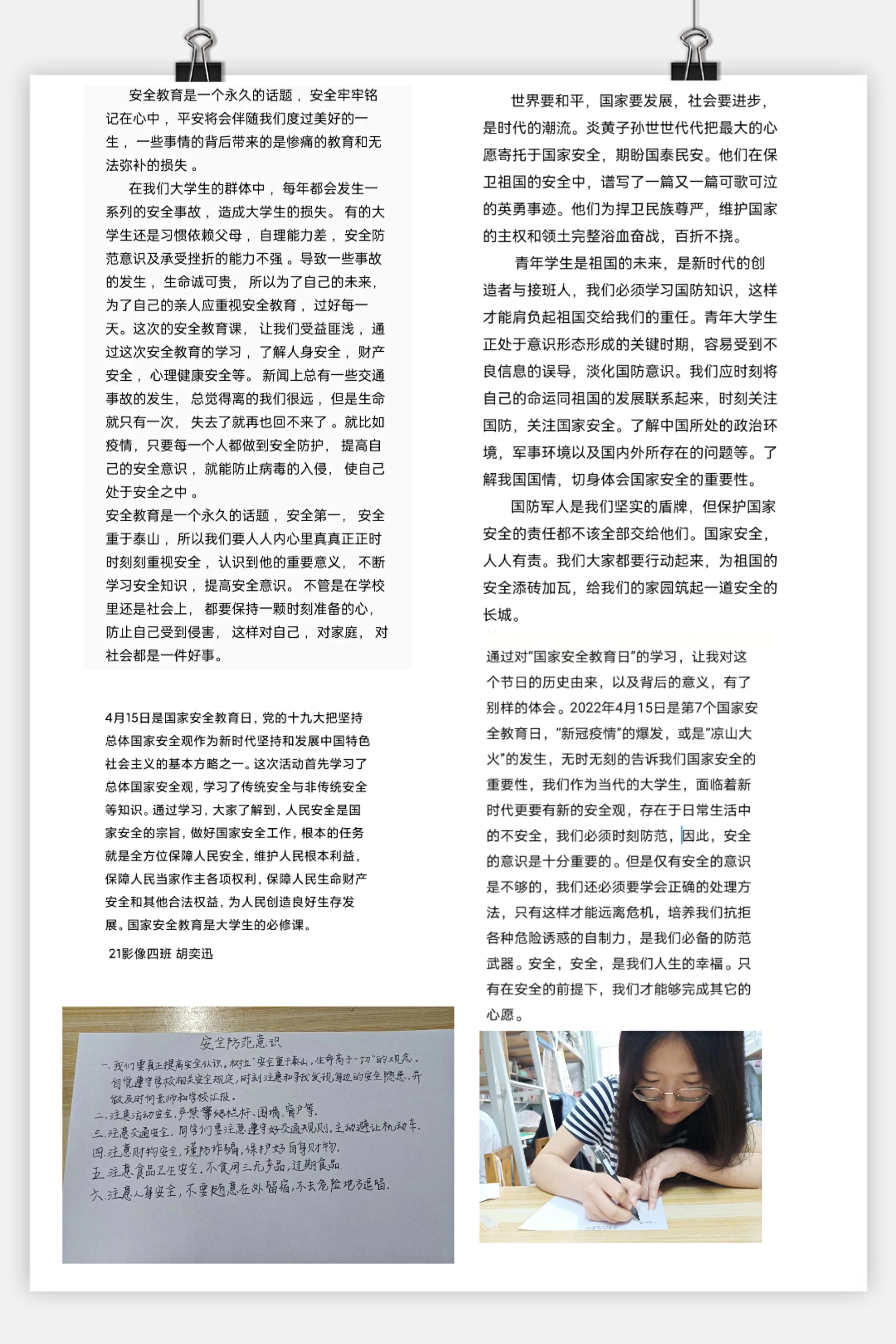 撰写学习心得 国家安全,关系你我。本次活动提高了同学们国家安全意识的同时,进一步弘扬了爱国主义精神,增强了同学们的民族凝聚力、向心力。同学们纷纷表示要肩负起保护国家安全重任,尽自己所能维护国家安全。