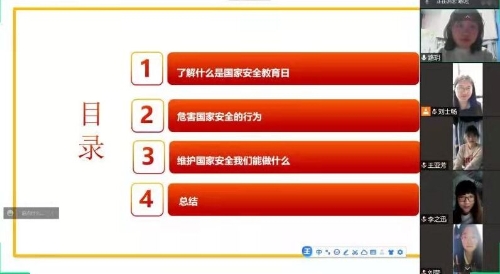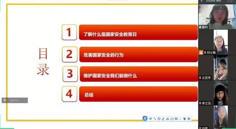 活动以线上专题宣讲和知识竞赛两种方式进行。4月13日,线上开展国家安全教育日专题宣讲活动,共238人参加,宣讲人是2021级路玥,她从国家安全教育日的由来、危害国家安全的行为、如何维护国家安全三个方面向大家介绍了国家安全的有关知识,让同学们对维护国家安全的重要性有了全面了解。4月14日,进行线上知识竞赛,边学边测、以测促学,进一步巩固宣教成果。经过激烈角逐,最终评选出一等奖3名,二等奖4名,三等奖5名。 此次活动中同学们深入学习了国家安全方面的知识,提高了同学们维护国家安全的意识,引导同学们在日常生活中从自身做起,自觉抵制破坏和损害国家安全的行为。 (点击每张图片即可查看原图)