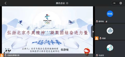 2022年4月14日,生物医学工程系通过腾讯会议形式开展北京冬奥精神系列宣讲活动第一讲。我校北京冬奥会志愿者激励助理、生物医学工程系党总支副书记张静敏担任主讲人,生物医学工程系2019级、2020级、2021级全体学生线上参加此次宣讲,活动由生物医学工程系正科级辅导员杨晓婧主持。 张静敏以“弘扬北京冬奥精神,凝聚团结奋进力量”为主题,从“解答奥运三问”出发,带领同学们回顾了中国第一次派运动员参加奥运会、第一次取得奥运会金牌、第一次举办奥运会的百年历程,同学们从中深刻感悟到祖国的强大是体育事业快速发展的根本保障。在“7年磨一剑,砥砺再出发”部分,她详细讲述了北京冬奥会冬残奥会筹办举办的艰辛过程,向同学们展示了北京冬奥会冬残奥会的“亮眼成绩单”。在“为北京冬奥盛会贡献承医力量”部分,她通过图文并茂的方式为同学们详细介绍了我校冬奥志愿者的招募、选拔、培训过程,师生志愿者参加洲际杯测试赛和北京冬奥会冬残奥会志愿服务的基本情况、收获的荣誉等。同学们切身感受到了我校为北京冬奥会冬残奥会成功举办所作出的贡献,为冬奥志愿者们的坚守和付出而深深感动。 (点击每张图片即可查看原图)