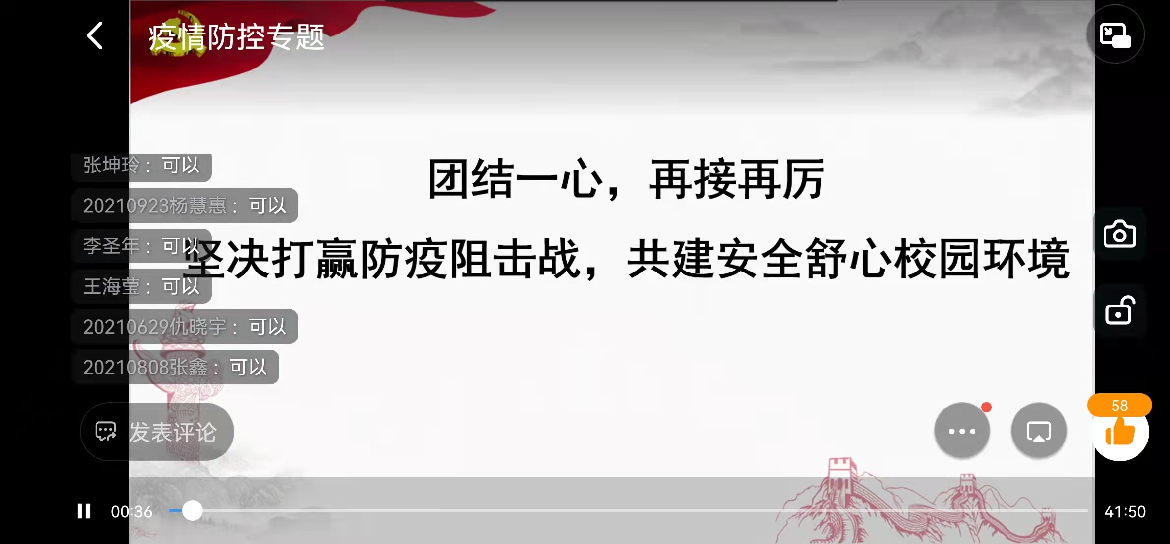 培训从当前疫情形势、校园疫情防控的特殊性以及疫情防控要求等三个大方面进行切入。从严格落实校园管理要求、实行校园疫情防控网格化管理、落实师生每日健康监测和核酸循环抽检、做好人文关怀等多个方面介绍了学校、学院开展的疫情防控相关工作,并向研究生发出“齐心协力,筑牢疫情防控坚实堤坝;携手并肩,共同守护校园安全底线”的疫情防控倡议,重点提示研究生防疫方法、遵守校园和基地纪律、加强心理疏导和提高防骗意识。 本次培训取得了良好的培训效果,缓解了研究生的焦虑情绪,增强了研究生对校园和基地疫情防控管理的正确认识,并积极配合落实校园和基地的疫情防控要求。 研究生学院将持续深入贯彻落实各级疫情防控决策部署,大力弘扬伟大抗疫精神,充分发挥基层党组织战斗堡垒和广大党员先锋模范作用,从严从实做好校园疫情防控工作。