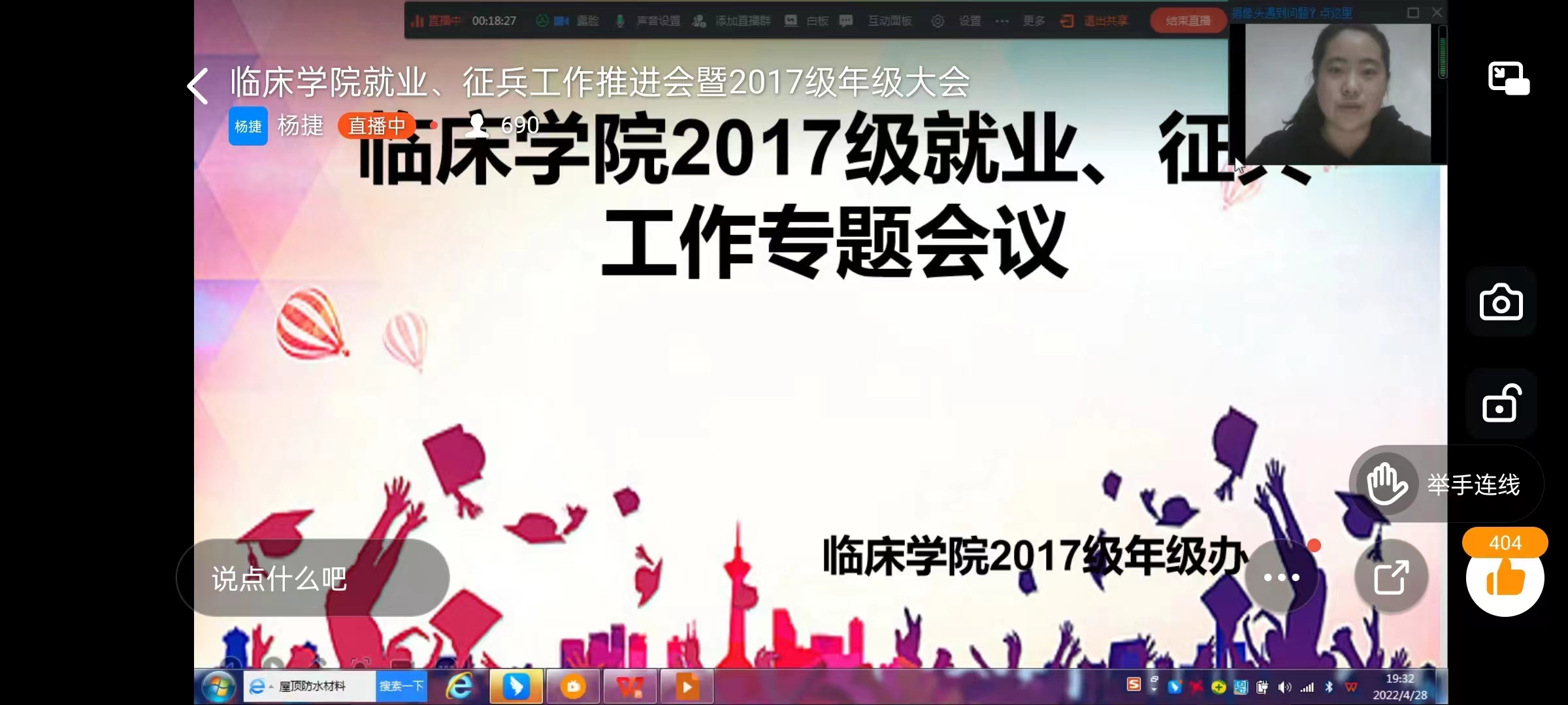 为帮助毕业生充分了解当前就业形式,提高学生就业和应征入伍的积极性,实现毕业生高质量就业的目标,临床学院于2022年4月28日召开毕业生就业、征兵工作专题会议,会议由2017级年级辅导员杨捷主持召开。