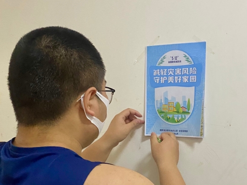 发放、张贴防灾减灾宣传单。志愿者在松鹤公寓发放印有各种灾害的预防及逃生措施的宣传单,以此提高广大群众遭遇突发事故的自救能力。同时将宣传单张贴于各楼层的通知栏处,进一步扩大防灾减灾知识的传播范围。