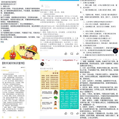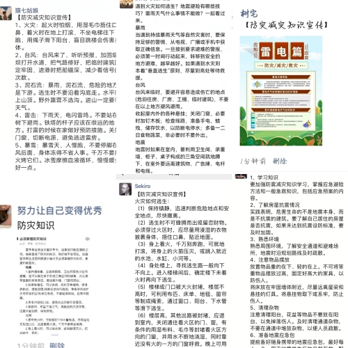 2022年5月12日是我国第14个“防灾减灾日”,为进一步增强同学们的防灾减灾意识,普及防灾减灾知识和避灾自救互救技能,不断提高师生的安全意识和应对突发事件的避险自救能力,最大限度地预防和减少各种安全事故的发生,临床学院2018级麻醉学第三青年志愿服务队于5月12日开展以“减轻灾害风险 守护美好家园”为主题的志愿宣传活动。 利用网络进行宣传教育。志愿者通过QQ空间和微信朋友圈积极宣传防灾减灾知识,其中包括地震、火灾、洪水等自然灾害的防范与自救,以此提高身边人对防灾减灾知识的了解。 (点击每张图片即可查看原图)