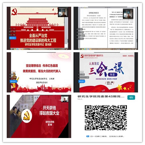 为扎实做好新时期党员发展和培养工作,加强对发展对象和入党积极分子的培养和教育,研究生学院党委于2022年5月7日至11日以钉钉群线上直播的形式开展第四十三期学生党校培训活动。研究生学院党委书记苗光新、副书记王悦婷、副科级专职辅导员庞健老师和办公室副主任夏楠老师分别作为主讲人参加了此次培训活动。 此次培训以专题授课的形式进行,苗光新以“推进党的建设新的伟大工程”为主题,从“总纲领”“政治建设”“思想建设”“决定因素”“人心向背”“纪律建设”“制度建设”和“反腐倡廉建设”等方面结合工作实际和具体案例,对党的建设进行了系统阐述和深入解读;苗光新以“怎样做合格党员”为主题,从“政治要求”“行为规范”“道德标准”和“实践路径”四个方面讲述如何成为一名合格的共产党员;王悦婷以“坚定理想信念,传承红色基因,做勇挑重担、堪当大任的时代新人”为主题,从“知党史、明理想,坚定理想信念”和“新时代、新使命,传承红色基因”等方面号召同学们要立大志、明大德、成大才、担大任,不负青春,不负韶华;庞健以“新时代三会一课”为主题,从“指导方向”“背景”“三会一课是什么”“支部党员大会”“支部委员会”“党小组会”和“党课”等方面为同学们梳理三会一课的深刻内涵,让同学们砥砺前行、做合格党员;夏楠以“开天辟地撑起救国大业”为主题,从“近代史的百家争鸣”“五四运动开启新民主主义”“马克思主义在中国传播”“南陈北李发起党建”和“工农革命曙光初照”等方面进行讲解,让同学们更加明白了“没有共产党就没有新中国”。 此次集中培训使发展对象以及入党积极分子深受鼓舞和感动,各位老师从不同的角度出发,做好疫情防控期间的价值观引领,提高学生党员、入党积极分子、发展党员的政治素质和党性修养,率领同学们以昂扬奋进的姿态,喜迎党的二十大。 (点击图片即可查看原图)