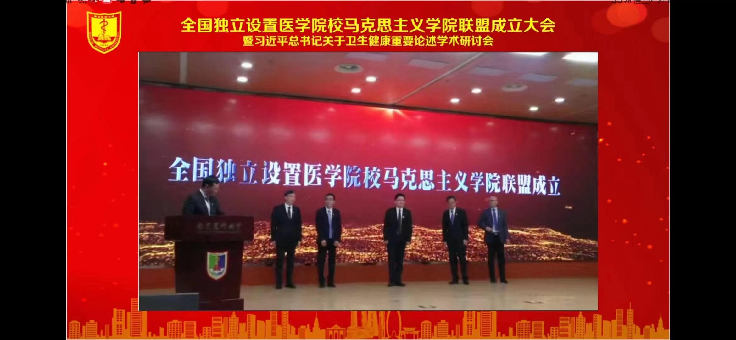 2022年5月14日,全国独立设置医学院校马克思主义学院联盟成立大会暨习近平总书记关于卫生健康重要论述学术研讨会在南京医科大学召开,会议以线上和线下混合方式进行。我校马克思主义学院成为联盟发起理事单位,马克思主义学院院长李德臣教授作为受邀嘉宾以云揭幕方式参加了开幕式,马克思主义学院副院长吴柏军和于多珠教授参加了线上开幕式和学术研讨会。于多珠教授撰写的《用校史滋养师德、用红医精神滋养医德》署名论文收录于首届独立设置医学院校马克思主义学院联盟论文集。