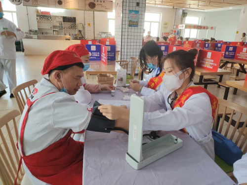 志愿者为食堂工作人员测量血压 这次活动不仅提高了大家的健康意识,还提升了后勤保障工作人员的幸福感。守护“桑榆”公益组织将继续不忘初心,砥砺前行,贯彻和践行有温度知冷暖的公益。