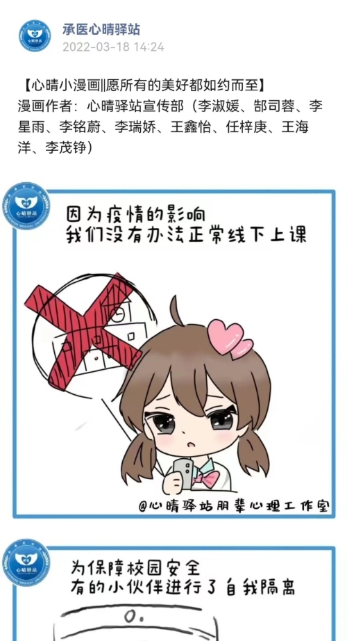 报道来源:中国大学生在线 报道原文如下: 承德医学院打造“心晴云端”品牌,通过“云端”普及积极心理健康教育、开展丰富有趣的心理健康活动,将爱与服务输送到学生身边。 伴随5G网络的普及和互联网+在高校教育教学中的应用普及,为通过新媒体开展心理健康教育奠定了坚实基础。为切实做好疫情防控工作,全国多所高校实行校园静态运行管理。校园静态运行管理期间,学生比较容易产生焦虑、紧张等情绪问题,同时可能会增加或激化部分原有心理健康问题或困惑学生,引发心理危机。此外,静态运行管理给学校原本面临的如心理健康教育专业师资紧缺、传统心理咨询在时间场地等方面限制受众面小、心理健康教育活动开展实效性等方面增加了困难和挑战。因此,“云端”心理健康教育应运而生,承德医学院打造“心晴云端”品牌,开拓心理健康教育工作新局面。通过“云端”普及积极心理健康品质教育、开展丰富有趣的线上线下联动心理健康活动、依托“云端”预约心理线上咨询等,将爱与服务从“云端”输送到学生身边。 心晴“云端”,聚焦普及积极心理知识,花式推送到身边 传统心理健康教育较多关注心理健康异常情况,较少从积极心理学视角出发,开展积极情绪、幸福观、和谐人际关系等普适性教育引导。面对疫情复杂多变情况,依托新媒体开展积极心理健康教育,作用突显。承德医学院多年来坚持培养学生积极向上的心理素养,一方面从纵向上抓好学生工作队伍、心理委员培训线上培训,提高心理健康教育和朋辈心理辅导的专业性;另一方面依托心晴“云端”,结合微信公众号、视频号、抖音号等新媒体,设计心理微课、暖心小贴士、心理健康生活指南、幸福观、恋爱观等积极心理健康微课、推文,定期及时推送全体在校生,用同学们喜闻乐见的图片、短视频、网文等网络新媒体作品,通过心晴“知”、“述”、“烩”、“show”、“录”、“约”6个板块,结合互联网+,普及宣传心理健康知识。 心晴“云端”,聚焦个体团体心理咨询,多样服务到身边 一直以来高校心理健康教育存在专业师资较少,一对一心理健康咨询受众面小,受时间、地点等因素限制性强等困扰。5G时代的到来给运用互联网+新媒体开展线上心理咨询相关功能提供了新的机遇和挑战,促进心理咨询更加快捷、便利和广泛开展。承德医学院心晴“云端”针对疫情期间封闭管理,上线心理咨询线上筛查、分类、预约和咨询等功能,尤其是通过线上预约团体心理辅导,可以有针对性的为申请班级定制团体活动,从自信心、自我悦纳、和谐人际关系、班级凝聚力等多个主题设计活动方案,形成班级“专属”团体方案,不仅提高了同学们参加心理活动的兴趣,更增强了团体心理辅导的有效性和普适性。 心晴“云端”,聚焦问题困惑心理需求,温暖关怀到身边 青年大学生在心理发展阶段中处于成年早期,心理的发展内涵不断丰富,需要完成自我同一性的确立,且仍具有两极性的特点,需要人际关系支撑,尤其是需要倾诉、宣泄和共情、有效反馈等。承德医学院心晴“云端”,依托微信公众平台,设立“心晴树洞”,多年来坚持线上“云对话”,让同学们尽情倾诉内心、宣泄情绪,并针对共性问题开设“解忧小课堂”、“心理健康沙龙”“心晴信箱”等模块,为同学们答疑解惑,解决问题。疫情校园封闭运行期间,有效针对隔离学生开展“暖心打卡”“纸传温情”等有温度的活动,运用手写信、心理小书签等将温暖与关怀送到学生身边,提升心理健康教育的温度。每年在学生入学、考研等关键时间节点录制加油视频,在疫情学校封闭管理期间制作《我在校园里·我很安全》抗疫原创视频等作品,师生纷纷转发,引导学生助力校园抗疫。 心晴“云端”,聚焦成长悦纳心理素养,专业测评到身边 心理健康教育是高校学生思想政治教育的重要内容,同时也是学生日常管理的重要模块。面对社会信息化、教育技术改革等背景,精准测评学生心理健康水平,建立全面、科学、便捷的学生心理健康台账,持续追踪学生心理健康情况,有针对性开展学生心理健康素养培养,是目前心理健康教育改进的方向。承德医学院心晴“云端”,通过学生工作平台管理录入特殊学生心理健康情况、每月统计学生个体、集体心理健康报表,逐步开放学生阶段性心理困惑、心理问题上报功能,除新生心理健康全面普测,还增加关键年级、关键时间节点专业性心理健康测评,提高学生自己和辅导员老师对学生心理健康成长的实际需求,如具体对不同学生存在人际困惑、家庭矛盾、学业问题等针对性进行心理素养培养,提升心理健康教育的精准度。 心晴“云端”,聚焦寓教于乐心理文化,精彩活动到身边 不断挖掘校园心理文化内涵,用学生们爱看、爱听、爱参与的方式,开展心理文化普及工作。承德医学院打造心晴“云端”心理育人平台,建设心理精品活动品牌。心晴“云端”,把心理健康教育活动主阵地从线下迁移,采用线上线下相结合的方式,让传统心理健康教育活动焕发新的生机和魅力,通过原创“心晴抗疫小漫画”、“抗疫手语舞”短视频大赛、线上线下联动“校园彩虹跑”、“线上情景剧”大赛等活动,潜移默化的让积极向上的生活学习理念深入人心。尤其是线上心理情景剧,原有以院系、班级为单位参加转变为以宿舍、自愿组