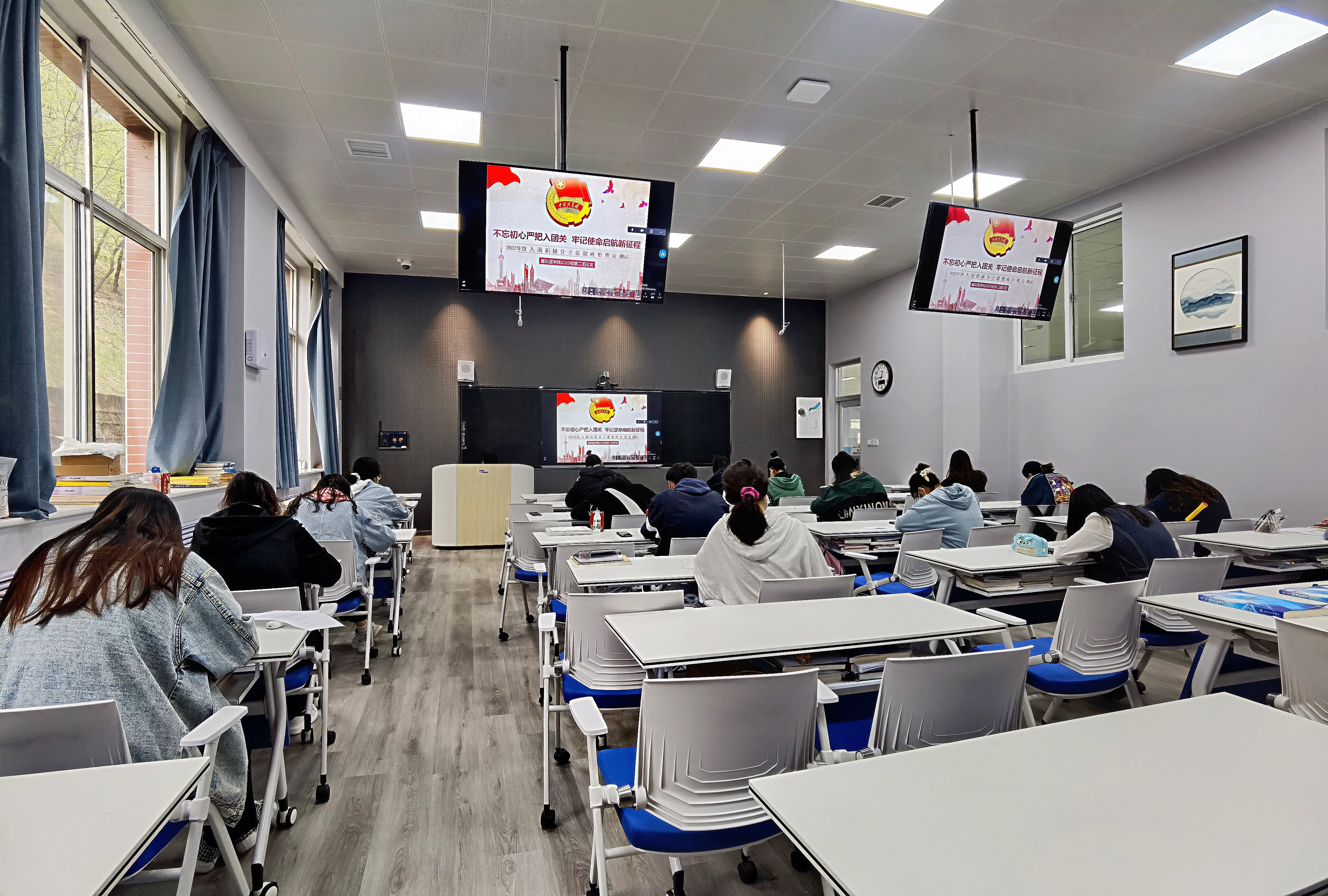 为继承和发扬五四精神,增强团员青年的责任感和荣誉感,进一步强化团员意识,引导广大团员不忘初心、牢记使命,听党话、跟党走,自觉加强组织性纪律性,基础医学院2020级第二团总支在2022年4月30日至5月4日期间举办了“不忘初心严把入团关,牢记使命启航新征程”系列活动,包括思想政治理论测验、团干部座谈会、“请党放心,强国有我”重温入团誓词活动和医学生誓言宣誓活动。 “不忘初心严把入团关,牢记使命启航新征程”思想政治理论测验 基础医学院2020级第二团总支于4月30日中午,在教学楼102组织入团积极分子、团支书进行思想政治理论测验,本次测验的目的为“以考促学,以学促行”,全面考察入团积极分子对共青团基础理论知识和思想政治理论的掌握程度。本次测验加强入团积极分子对中国共产主义青年团的认识,强化了入团的严肃性和荣誉感,增强了团干部的责任感与担当意识。 (点击每张图片即可查看原图)