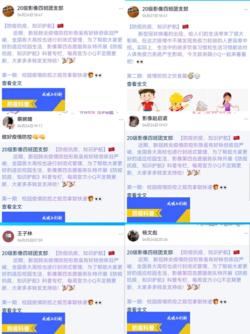 志愿服务 防疫抗疫,知识护航 为传承雷锋精神、积极响应“奉献、友爱、互助、进步”的志愿服务精神,全体同学参与了“防疫抗疫,知识护航”主题活动,利用QQ等社交平台,开设六期关于疫情防控小知识的栏目,并通过同学们的转发、留言,充分进行宣传,让更多的人了解到防疫知识。