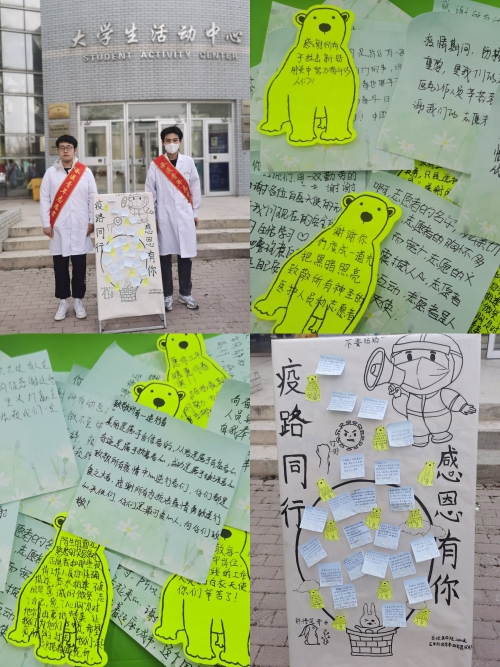 防疫知识宣传 疫路同行,感恩有你 该志愿服务队的同学们通过便签纸粘贴留言的形式,表达对疫情工作者的感激之情;以感谢信的形式,感谢在校老师、食堂工作人员、超市工作人员等所有在校园封闭管理期间仍然坚守岗位,为同学们的日常生活罩上一层“防护罩”的人们,感恩他们的辛苦付出,正因为有他们,才实现了疫情防控期间校园的正常运转,才能让同学们在承医这片土壤上茂盛成长。他们都是抗疫防线的“防护墙”,我们当践行“健康所系、性命相托”的医学生誓言,以小我融入大我,在与祖国的深切联结中谱写青春之歌,弘扬爱国风采。