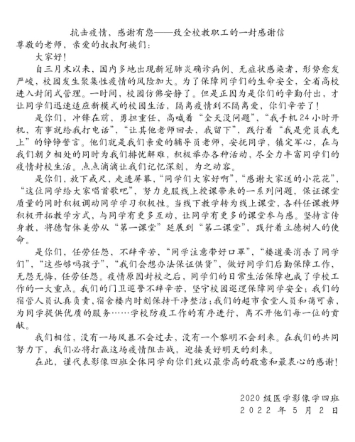 感谢信 且听风吟,静待花开 在封闭管理期间,为丰富学生的课余生活,展现青年积极乐观的形象,该志愿服务队组织了一场以班内同学为主的摄影比赛,鼓励同学们拍摄学校的风景照片,用自己的双眼发现生活中的美好,从不同角度来展现承医美景,表达同学们对于疫情过后,春暖花开的殷切期盼。