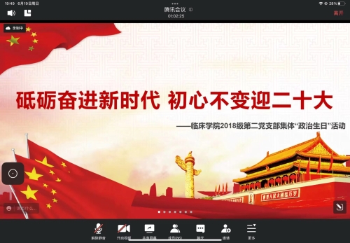 不忘初心,方得始终。为深入强化党员的身份意识和责任意识,加强党员党性教育,增强党员的责任感和使命感,引导党员充分发挥先锋模范作用,临床学院2018级学生第二党支部在2022年6月19日开展党员政治生日主题活动。 活动中,第二党小组刘海杰同志、第三党小组李树宅同志、第五党小组冯志新同志等党员回忆入党初心,分享加入中国共产党的心路历程,聚焦自己成长和入党以来的追求与表现,简要总结过去一年中取得的成绩,根据自身实际情况,查找差距,深入进行自我剖析,展望未来努力方向。 通过各位党员的分享,各党小组成员相互交流、相互学习,提高了思想认识,全体党员纷纷表示:在接下来的日子里,我们将不忘初心,牢记使命,踔厉奋发,接续奋斗! (点击图片即可查看原图)