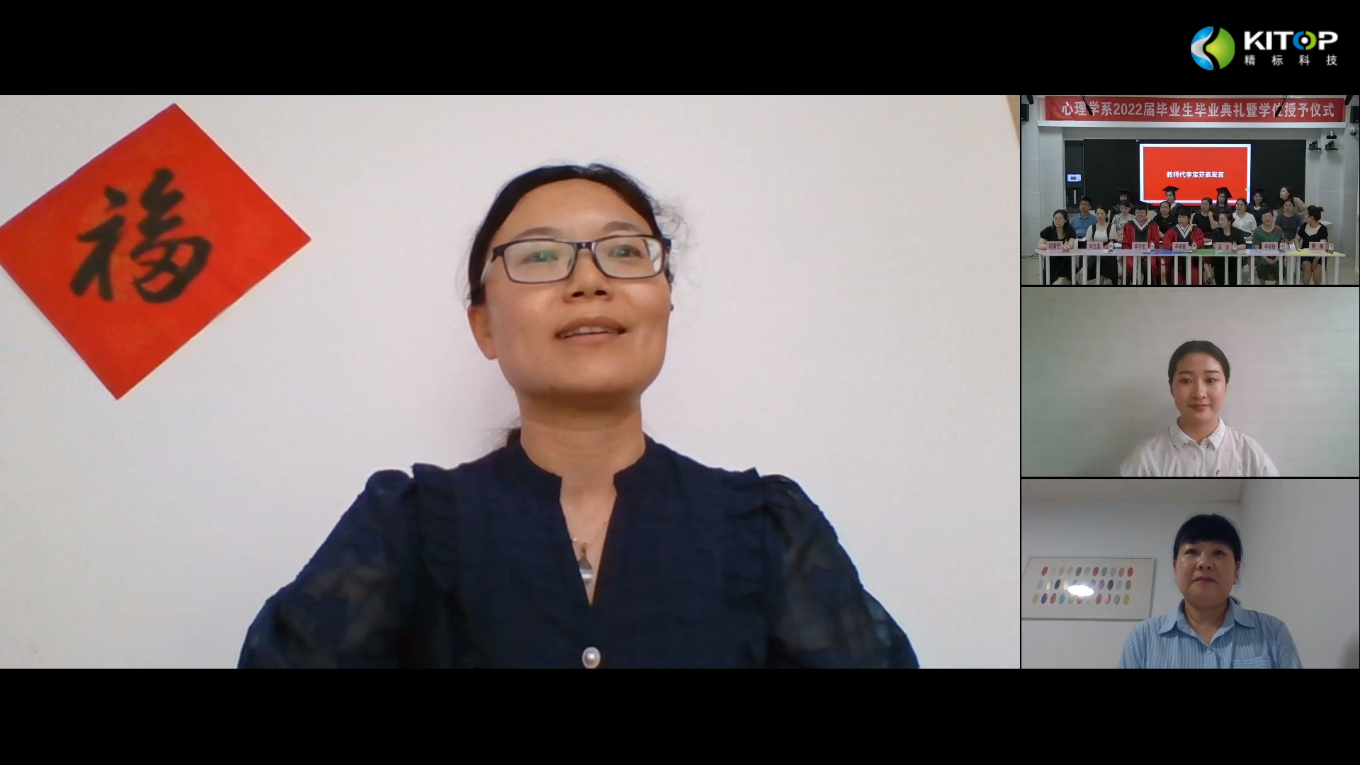 2022年6月21日,心理学系2022届本科毕业生云毕业典礼暨学位授予仪式在护理心理楼409教室和线上直播间同步举行。心理学系全体教师、全体毕业生共同出席,相聚云端。典礼由辅导员柳楠主持。 典礼在校长唐世英教授寄语毕业生的讲话中拉开序幕,心理学系党总支书记龚理宣读心理学系2022届本科毕业生学位授予名单,党总支副书记徐晓惠宣读优秀毕业生名单。心理学系主任李晓敏、副主任李宇彤及教师代表为毕业生代表颁发毕业证、学位证并授予学位。 难忘师生情,师生互赠离别礼物后,2022届毕业生代表于清华代表全体毕业生发言。她回顾了四年来在母校的成长历程,深情表达对母校和全体老师的感激之情,并表示将携带母校的祝福、恩师的期望,用所学报效祖国、服务社会。 学校教师基本功大赛一等奖获得者、天津师范大学在读博士李宝芬副教授作为教师代表发言,她向毕业生提出了叮咛和嘱托:希望大家能够保持热爱,保持心理学人的初心,树立远大理想,将心理学继续发扬光大。 最后,李晓敏教授致辞,她借用“东方甄选”的主播董宇辉的话语告诫毕业生:“人生短期拼智力,中期拼毅力,长期拼体力,不要觉得自己落后了,要用马拉松的心态去过这一生。”她祝愿毕业生能以一颗敏锐而包容的心去认识自己和世界,更坚强、更豁达地与自己和世界和解,拥有心理学所赋予的改造自己和世界的智慧和勇气,谱写独一无二的美丽人生。 典礼在师生依依惜别、恋恋不舍中圆满落幕。 祝福2022届毕业生从“心”出发,一路精彩! (点击每张图片即可查看原图)