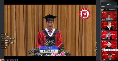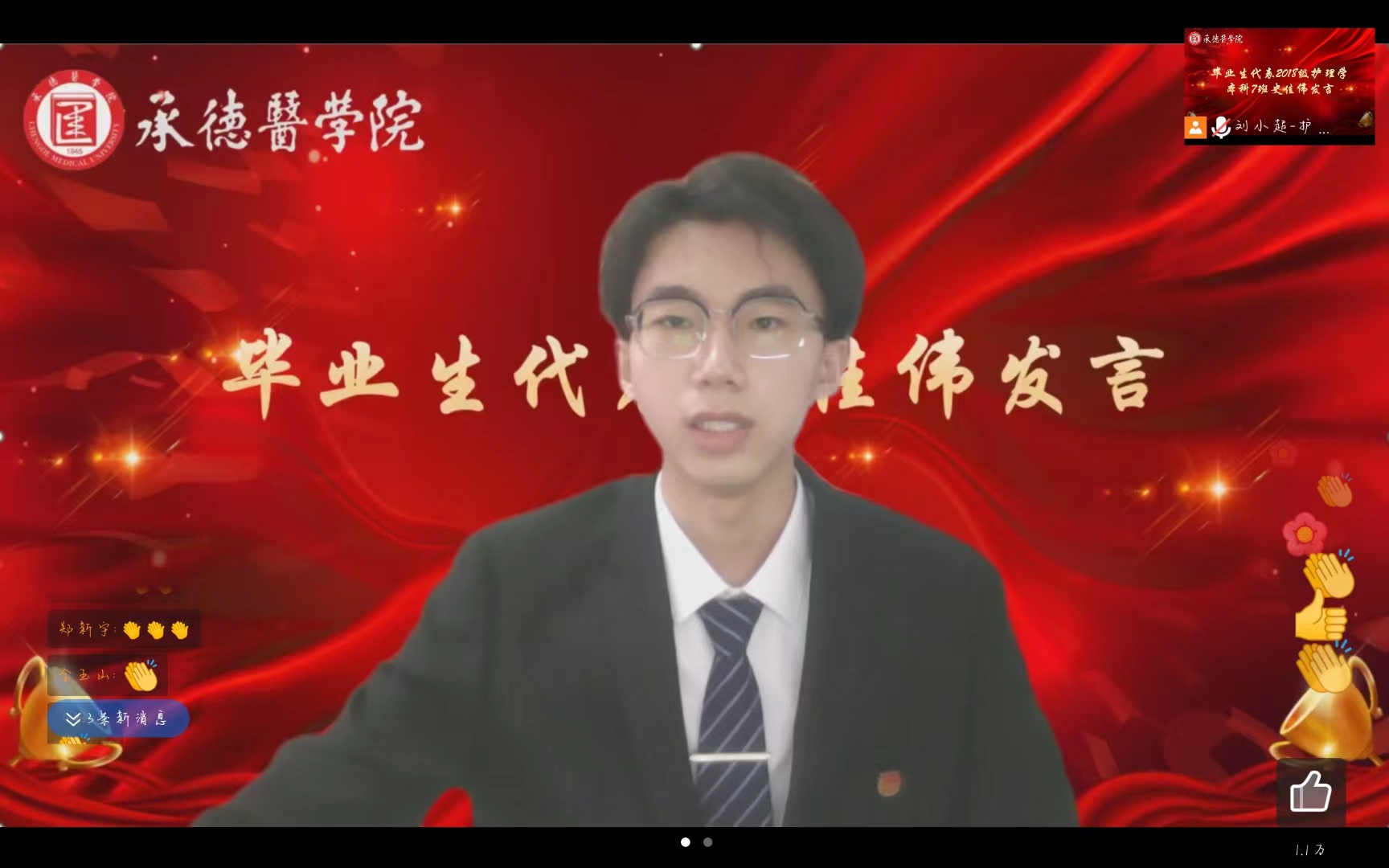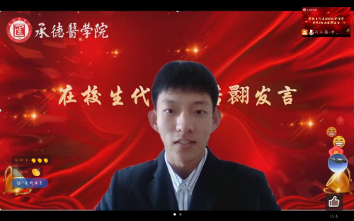 毕业生代表史佳伟发言 在校生代表王若翾发言,表达了对学长学姐衷心的祝愿和不舍之情,并表示在今后的学习和生活中继续脚踏实地,勤于实践,勇于创新,用青春和智慧续写承医的辉煌篇章。