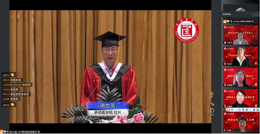 2022年6月25日上午,护理系2022届毕业典礼暨学位授予仪式于线上隆重举行,护理系领导班子成员、全体教师及2022届全体毕业生参加典礼。毕业生辅导员齐新玉主持典礼。 典礼开始前,播放了护理系全体教师对2022届毕业生的寄语视频。毕业生们备受鼓舞,坚信在未来的日子里可以带着老师们的祝福和期盼,从承医出发,逐梦启航。 在雄壮的国歌声中,毕业典礼拉开帷幕。毕业生们认真观看校长唐世英教授毕业寄语视频,护理系党委书记王亦娜宣读护理系2022届毕业生名单,护理系副主任郑纪宁宣读授予护理系2022届学士学位者名单,护理系党委副书记朱炎杰宣读2022届河北省优秀毕业生名单。 (点击每张图片即可查看原图)