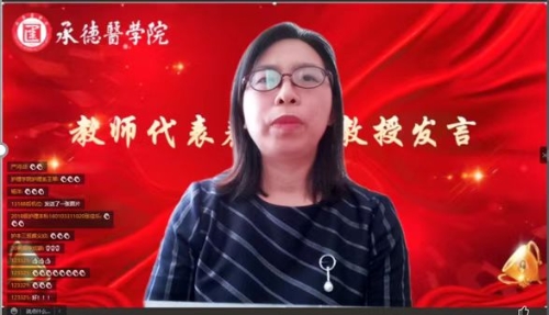 在校生代表王若翾发言 内科护理学教研室主任秦殿菊教授代表教师发言,她回顾了四年来与学生共同学习和生活的点点滴滴,希望同学们在新征程中,勤奋努力、不懈奋斗,打造自己的精彩人生。