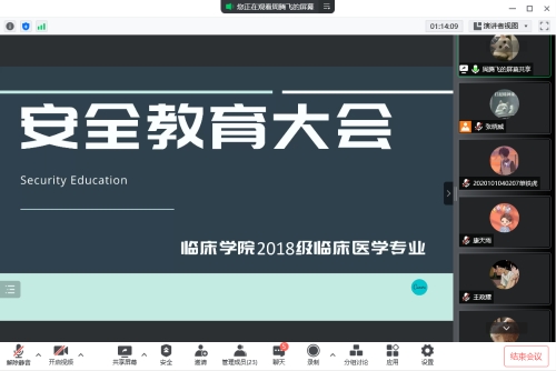 为进一步提高同学们的安全意识,加强学生的教育管理,充分发挥学生干部在学生在院实习中的模范带头作用,做好期间学生管理工作,2022年6月24日晚8点,临床学院2018级临床医学专业在“腾讯会议”平台召开学生干部线上会议。本次会议由临床学院2018级临床医学辅导员周腾飞主持,全体班干部参加此次会议。 会上,周腾飞首先对进入实习阶段的同学们表达关心和问候,对全体班干部在入院见习实习以来积极配合年级工作表示感谢。同时,对于未来一年的实习工作的开展提出要求。除服从医院安排,认真学习、工作外,她着重强调了安全教育相关问题:第一,注意用电安全,要做到宿舍人走断电,人走锁门;第二,重视防溺水与中暑问题;第三,财产安全、电信诈骗的问题仍不可忽视。周腾飞为大家讲授“防诈骗秘籍”,提示同学们提高警戒,谨防诈骗。在疫情防控方面,强调疫情防控仍不可忽视,就疫情防控工作的重要性做出说明。她指出,班干部要发挥年级与同学之间的桥梁作用,做好教育沟通工作,确保安全教育顺利开展。 此次大会是年级学生工作办公室对于学生安全教育工作高度重视的体现。进一步提高了同学们对于宿舍安全、网络安全、交通安全、防溺水、疫情防控等方面的认识,同时也为未来同学们的学习实习和生活工作打下基础。 (点击图片即可查看原图)