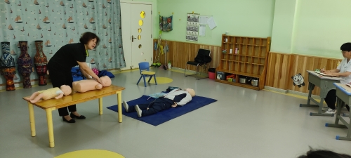 彭丹梅老师讲解示范急救操作 活动中,彭丹梅老师和志愿者用通俗易懂的语言分别为大家讲解了成人、儿童和婴儿的基础生命支持(BLS,又称现场心肺复苏)、海姆立克急救术和绷带包扎,让幼师们对相关急救术的概念、适应症、操作流程等有了初步认识。通过医学知识教育和正确的操作,将烧伤、烫伤以及流鼻血等紧急情况的应对方法一一进行讲解和演示,让幼师们来更好地应对生活中的“小意外”。应用“模拟人”教具为幼师们示范了急救操作方法,介绍了相关注意事项。幼师们在观看学习后,积极踊跃上台进行了现场操作演练,彭丹梅老师和志愿者手把手指导幼师们的动作,幼师通过亲自操作、亲身体验进一步巩固了所学知识,掌握了现场急救的基本技能,并纷纷表示,自己将学以致用,教会身边人。