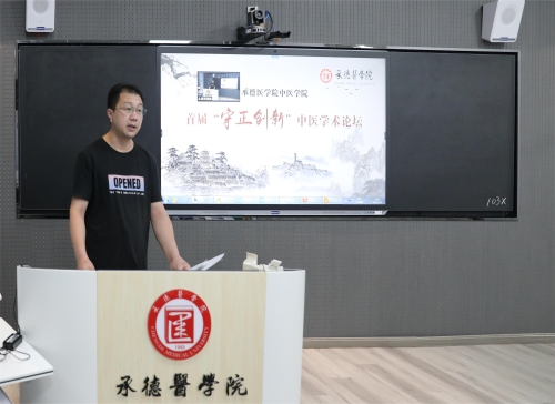 为推动我校中医药科研工作,促进专业及学科建设,提高我校中医学类人才培养质量,中医系于 2022年 7 月 24 日举办首届“守正创新”中医学术论坛。论坛邀请江西省名中医刘英锋教授、河南中医药大学针灸研究所所长高希言教授、山东中医药大学张永臣教授、华北理工大学中医学院党委书记吴范武教授、辽宁中医药大学中医药科学院副院长乔铁教授共 5 位专家学者进行专题汇报。我校副校长李玉红、张凯参加开幕式。中医系副主任郭建恩主持论坛开幕式。 (点击每张图片即可查看原图)