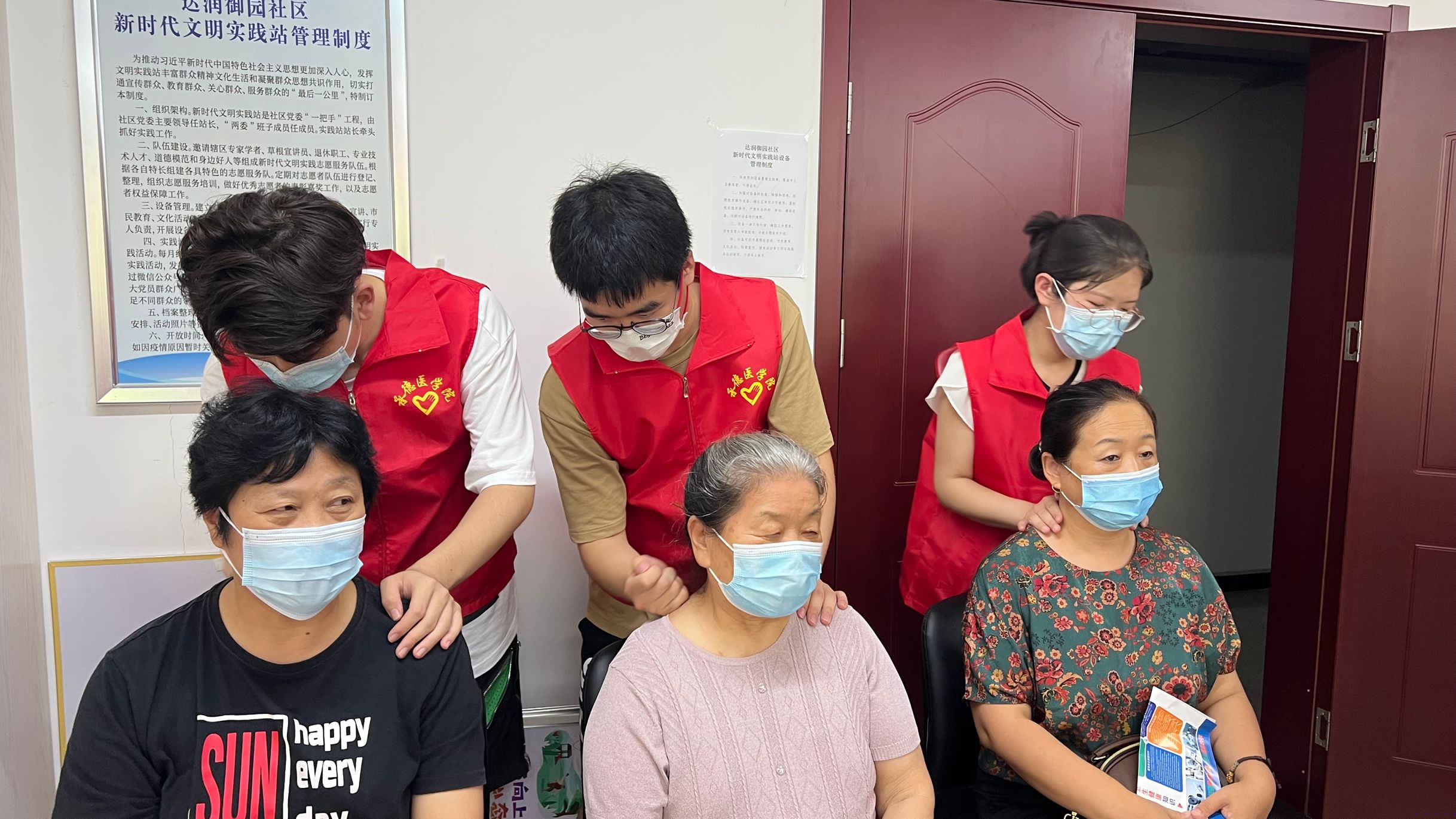 实践队员协助小朋友们制作香囊 当天,实践团成员们还在社区开展推拿按摩、血压测量等志愿服务,耐心细致地解答居民们咨询的健康常识问题,讲解医疗卫生健康知识,宣传疫情防控政策以及日常生活卫生习惯等注意事项,还为居民发放了健康养生食谱和健康知识宣传单,得到居民的认可和赞扬。
