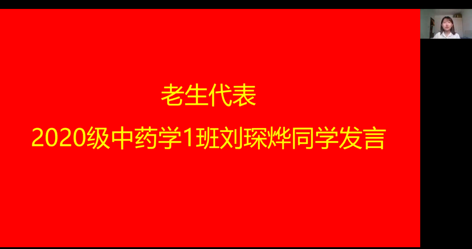 中药学系2022级药学1班闫佳鑫发言 本次云端开学典礼的举行,使2022级新生对中药学专业、中药学系的老师们有了深入的了解,感受到了中药学系大家庭的关心和温暖。大学是人生新的起点,而新生是最新鲜的血液,希望2022级的新同学们能够携起手来,共同谱写出更加辉煌的篇章。