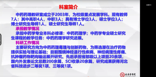 中药学系主任、中药研究所所长赵春颖致辞 按照百家姓的姓氏排名顺序,老师和同学们依次打开摄像头,进行云端见面。随后播放了中药学系简介视频,同学们跟随镜头了解了中药学系。 中药学系七大教研室、两个实验室的教师代表为2022级新生对科室进行了介绍,通过老师们的介绍,同学们了解到了在今后的学习中将学到哪些知识和技能。中药药理教研室刘玉玲老师为同学们介绍了中药学系的发展史。