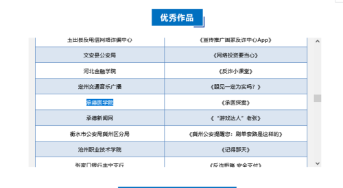 我校学生作品在“冀网同心 全民反诈”网络宣传精品推选展播活动中荣获优秀奖 我校学生在活动中的优异表现与积极参与展现了承医学子在共同打击电信网络诈骗、热心社会公益宣传中的优秀风貌。用切实行动推动反诈网络宣传引导和正能量传播,助力反诈宣传广接地气、深入人心。