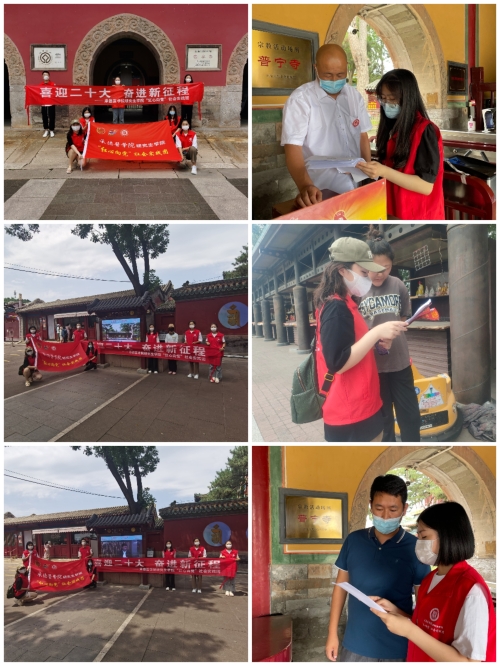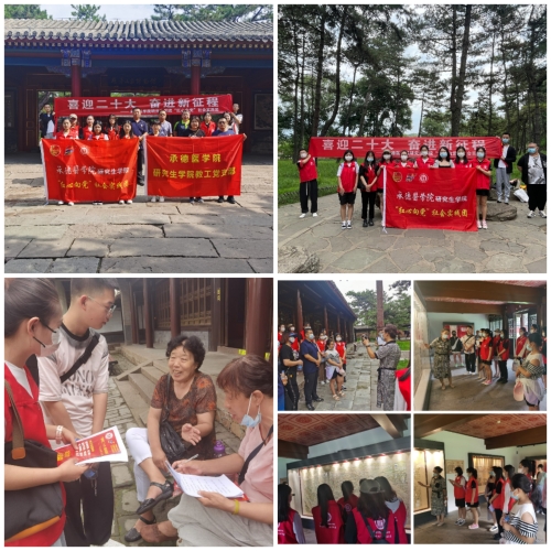 为深入学习贯彻习近平新时代中国特色社会主义思想,以实际行动庆祝中国共产党成立一百零一周年,喜迎党的二十大胜利召开,回应习近平总书记“未来属于青年,希望寄予青年”这一深厚期许和深情嘱托,研究生学院20名在校生联合教工党支部党员教师共同组成“红心向党”社会实践团于2022年7月8日—7月15日在河北省承德市开展为期8天的“喜迎二十大,奋进新征程”暑期“三下乡”系列社会实践活动。 探寻传统建筑,坚定文化自信,书写青年传承 7月8日,实践团队走进避暑山庄,团队成员于避暑山庄丽正门向工作人员及景区游客共发放两百余份宣传单、一百五十余份问卷,在景区内,同学们用电脑播放相关视频及PPT,为两百余游客宣讲“喜迎二十大,奋进新征程”、习近平新时代中国特色社会主义思想相关理论知识。此外,团队成员进入博物馆,由文物讲解员讲解,为成员介绍传统文化建筑的丰富内涵及民族宗教政策。同学们纷纷表示自己收获颇丰,了解到了中华文化的源远流长与博大精深,更是激发了自身不懈奋斗的动力。 (点击每张图片即可查看原图)