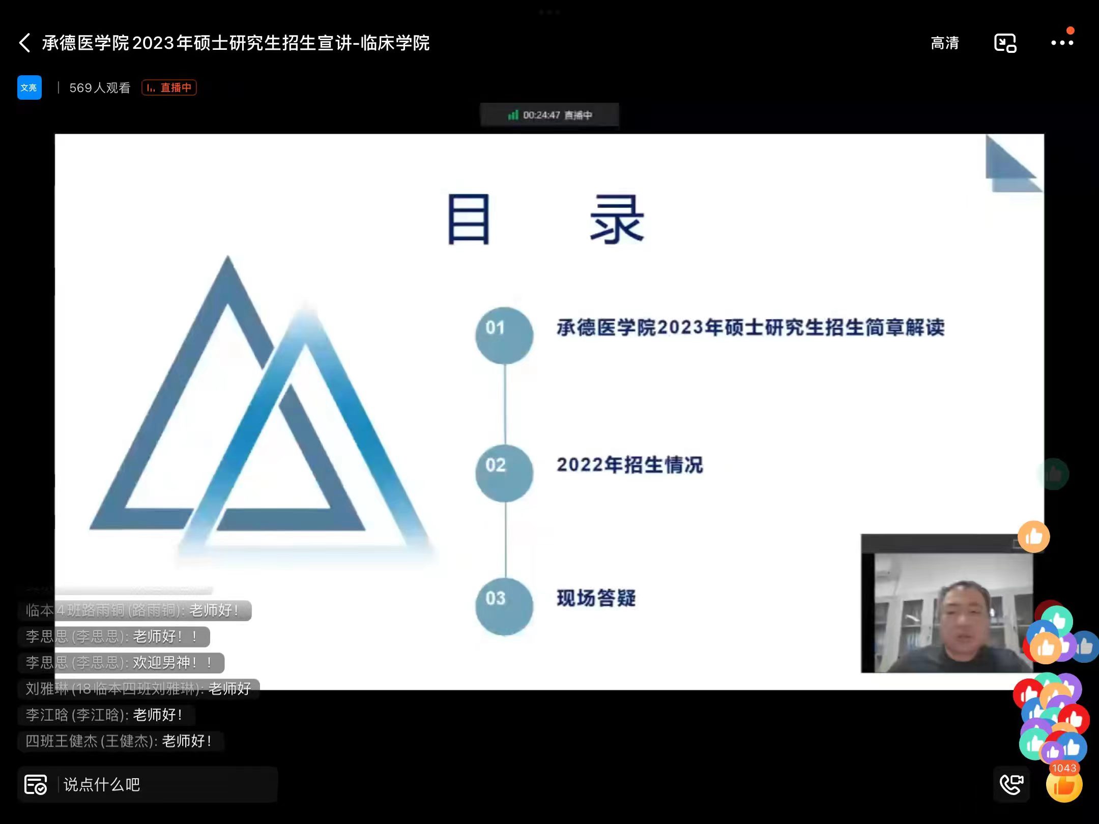为帮助2023届考研学生做好考研的合理规划和报名选择,进一步做好考研服务工作,2022年9月23日晚,临床学院以线上直播的形式开展“同心逐梦,一战成硕”研究生招生宣讲暨考研报名指导会。辅导员周腾飞主持会议,临床学院党委书记王瑞婷、研究生学院招生就业办公室付文亮老师主讲,2018级临床医学专业全体考研学生参加。 会上,付文亮就承德医学院招生简章作了详细说明,强调了报考流程和注意事项,介绍了我校研究生招生录取规则与历年录取情况,详细解读了当前的研究生招生形势和相关政策,引导同学们充分认识考研对个人发展的重要意义,合理确定考研目标。 王瑞婷结合以往考研学生的具体案例,深入分析了影响同学们报考前心态的主要因素,给予了相应的指导和鼓励,并就同学们提出的考研报考、专业选择等方面的共性问题提供了详细解答;鼓励同学们根据自己的实际情况和学术兴趣选择适合自己的研究方向进行申报,实事求是、认真研判、准确定位,全力以赴结出考研硕果。 此次宣讲指导会作为临床学院学风建设的重要一环,为立志考研的学生们指引了前进的方向、提供了宝贵的建议,同时引导广大学子用奋斗擦亮青春底色,积极投身到考研奋战的新征程中去。 (点击图片即可查看原图)