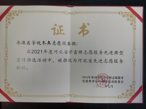 河北省先进志愿服务组织证书 我校冬奥志愿服务团成立于2020年1月,由47名师生组成,服务于国家越野滑雪中心、国家跳台滑雪中心、交通设施等3个场馆,涉及反兴奋剂、公共卫生、交通等3个业务领域,总服务天数达100天,总训练时长近300个小时,累计服务时长3.0万个小时。师生出色完成各项工作,被中央电视台、河北新闻网、承德日报等市级以上媒体报道8次。团队被北京冬奥组委、中共河北省委、河北省人民政府评为“2022年北京冬奥会、冬残奥会河北省先进集体”,以实际行动践行了“请党放心,冬奥有我”的铮铮誓言,为北京冬奥会、冬残奥会的成功举办贡献了承医力量。