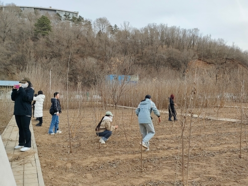 同学们清理园圃 此次活动分为三个部分,第一部分,学习蚕文化。研究所老师贾漫丽在蚕文化展廊为同学们详细介绍了我国蚕文化的起源和发展,还对当今一带一路等国际贸易体系进行了讲解。第二部分,参观蚕业辉煌成就。同学们邀请了蚕业研究所党总支书记马超讲解蚕文化故事。其中,桑树跨育和蚕“浑身是宝”的属性令同学们印象深刻。第三部分,实地探访蚕桑科技园。马超带领各位同学参观了蚕育的整体生态链。其中,育树育蚕育羊一体化建设是高效能蚕桑科技园的重大成果。此外,同学们在露天桑树园圃进行了清理工作,随后又走进大棚温育的桑园,感受桑树挂果的喜悦。